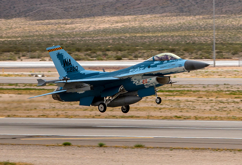 NELLIS AIR FORCE BASE, NV, UNITED STATES 05.23.2019 - The newly painted F-16 Fighting Falcon takes off for its first flight as the “Ghost” at Nellis AFB, Nev., May 23, 2019. The Ghost paint scheme idea was generated from the 57th Wing commander’s social media account, looking for a fresh new look for the 64th Aggressors Squadron jet. (U.S. Air Force photo by Staff Sgt. Tabatha McCarthy)
