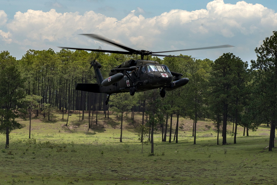 COMAYAGUA, HONDURAS 05.21.2019 - A HH-60 Blackhawk from the 1st Battalion 228th Aviation Regiment lands at a simulated aircraft crash to receive casualties during a search and rescue exercise, May 21, 2019, in Comayagua, Honduras. Members from various units on Joint Task Force Bravo participated in the exercise that simulated a HH-60 Blackhawk crashed during a routine flight carrying personnel. The exercise practiced notification, recall, search and rescue, on-scene medical care, recovery of personnel from low and high angle austere terrain, and medical care once the injured returned to base. (U.S. Air Force photo by Staff Sgt. Eric Summers Jr.)
