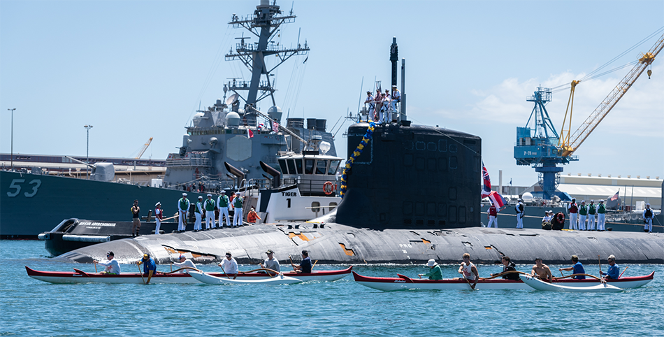 PEARL HARBOR (June 6, 2019) Members of the Outrigger Canoe Club escort the Virginia-class fast attack submarine USS Hawaii (SSN 776) as it arrives, June 6, 2019, at Joint Base Pearl Harbor-Hickam after completing its latest deployment. (U.S. Navy photo by Mass Communication Specialist 1st Class Daniel Hinton)