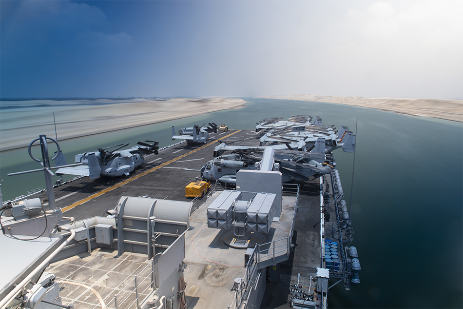 SUEZ CANAL (June 23, 2019) The Wasp-class amphibious assault ship USS Kearsarge (LHD 3) transits the Suez Canal. Kearsarge is the flagship for the Kearsarge Amphibious Ready Group and, with the embarked 22nd Marine Expeditionary Unit, is deployed to the U.S. 5th Fleet area of operations in support of naval operations to ensure maritime stability and security in the Central Region, connecting the Mediterranean and the Pacific through the Western Indian Ocean and three strategic choke points. (U.S. Navy photo by Mass Communication Specialist 1st Class Michael DiMestico)