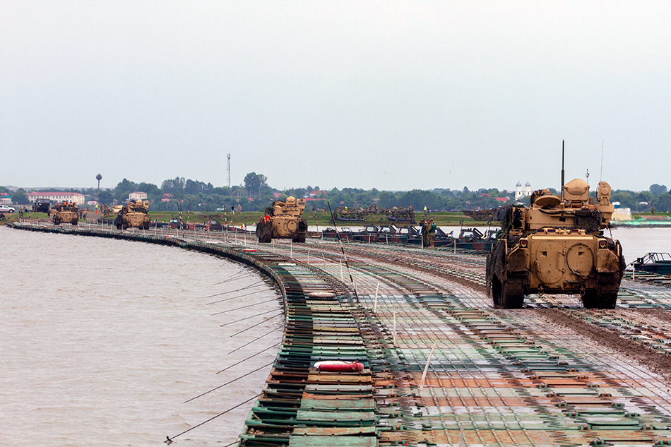 M3 Bradley Fighting Vehicles assigned to 1st Battalion, 16th Infantry Regiment, 1st Armored Brigade Combat Team, 1st Infantry Division cross the Danube river during the culminating exercise of Saber Guardian 19 at Bordusani Romania, June 20, 2019. Saber Guardian 2019 is an exercise co-led by Romanian Land Forces and U.S. Army Europe designed to improve the integration of multinational combat forces. (U.S. Army photo by Staff Sgt. True Thao)