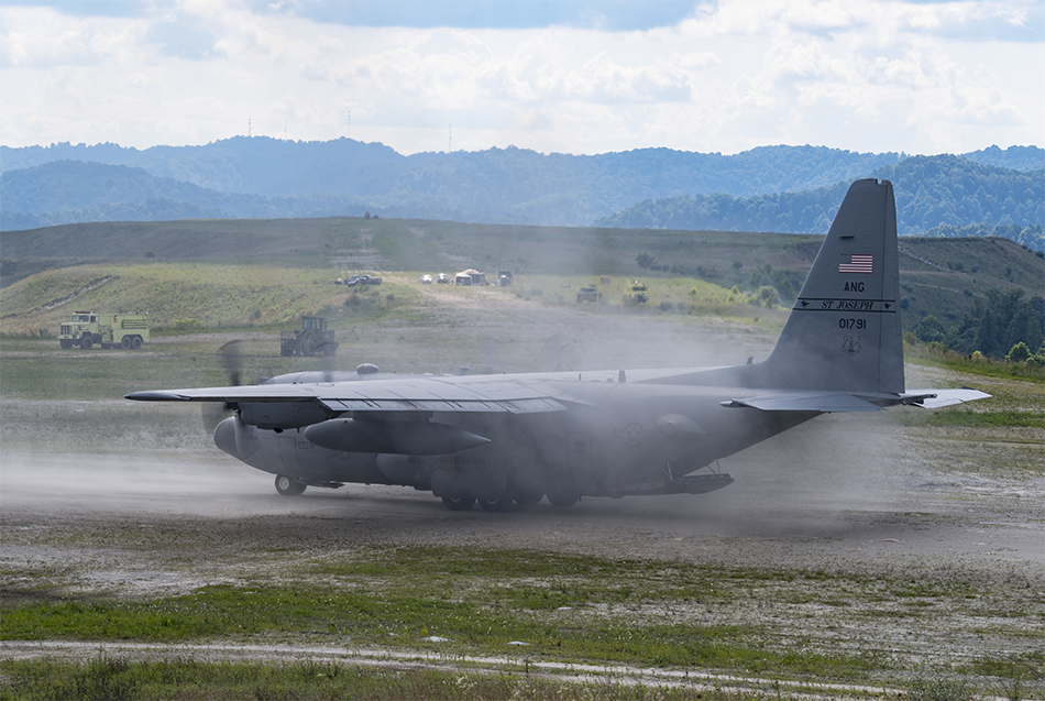A C-130H Hercules assigned to the 139th Airlift Wing, Rosecrans Air National Guard Base, St. Joseph, Mo., lands on a dirt runway after performing an airdrop during exercise Sentry Storm 19, July 23, 2019, at Camp Branch Drop Zone, Logan County, W.Va. Sentry Storm is a West Virginia National Guard-led joint exercise involving 15 separate military and civilian organizations. (U.S. Air National Guard photo by Master Sgt. De-Juan Haley)