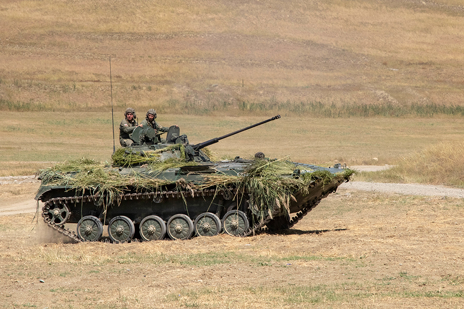 Georgian Defense Force soldiers prepare to move a BMP-2 Infantry Fighting Vehicle during the Agile Spirit 19 closing ceremony live-fire exercise on August 9, 2019, at the Orpholo Training Area, Georgia. AsG19 is a joint, multinational exercise co-led by the Georgian Defense Forces and U.S. Army Europe. Occurring July 27 through August 9, 2019, the brigade-level exercise incorporates a command post exercise, field training exercise, and live-fires. Agile Spirit enhances U.S., Georgian, allied and partner forces' lethality, interoperability and readiness in a realistic training environment. (U.S. Army photo by Spc. Ethan Valetski)