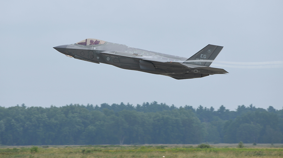 A 33rd Fighter Wing F-35A Lightning II takes off, during the Northern Lightning exercise at Volk Field, Wisconsin, Aug. 12, 2019. The Northern Lightning exercise brings together the joint total force of the next generation of air superiority. (U.S. Air Force photo by Airman 1st Class Heather Leveille)