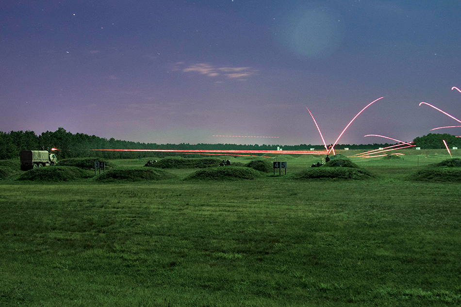 JOINT BASE CAPE COD, Mass. – Soldiers from the 1058th Transportation Company, Massachusetts National Guard, conduct a night base defense live-fire exercise under the illumination of a green flare during the Combined Arms Exercise: Patriot Crucible, here, August 1st, 2019. This is the first time in twenty years that Soldiers have been able to conduct night fire with pyrotechnics and flares at Camp Edwards. Patriot Crucible is an intense two-week field exercise preparing army combat support units from across the North East United States to support major combat operations against a modern and professional enemy force. (U.S. Army National Guard photo by Staff Sgt. Steven C. Eaton, 65th Press Camp Headquarters, Massachusetts National Guard)