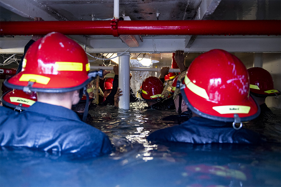 NAVAL STATION MAYPORT, Fla. (Aug. 15, 2019) Sailors conduct damage control training at the Basic Shipboard Damage Control Wet Trainer located at Naval Station Mayport, Fla., on Aug. 15, 2019. The trainer is designed to test the teamwork and damage control capabilities for crews and Sailors preparing to deploy aboard naval vessels. (U.S. Navy photo by Mass Communication Specialist 3rd Class Nathan T. Beard)