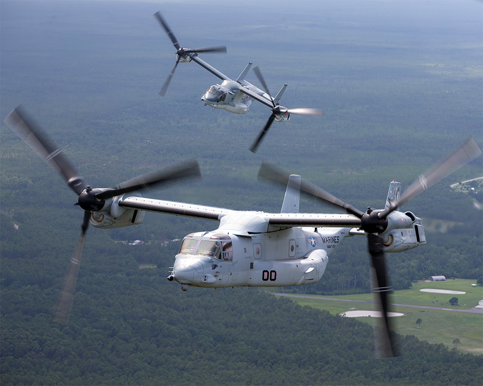 NEW RIVER, N.C. (July 9, 2019) A U.S. Marine Corps MV-22B, front, and a Japan Ground Self-Defense Force (JGSDF) V-22 Osprey conduct aerial maneuvers at Marine Corps Air Station New River, North Carolina, July 9, 2019. Marines assigned to Marine Medium Tiltrotor Training Squadron 204 and JGSDF soldiers conducted a confined area landing exercise as part of their integrated training, strengthening relations and interoperability between the North Atlantic Treaty Organization allies. (U.S. Marine Corps photo by Lance Cpl. Elias E. Pimentel III)