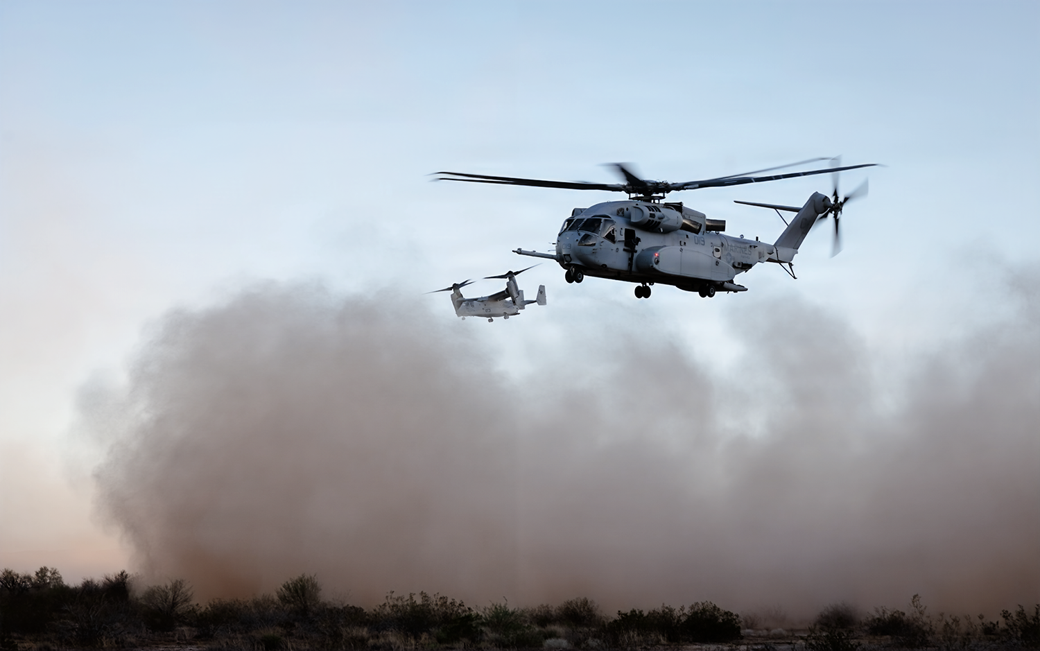 U.S. Marine Corps CH-53E Super Stallion and an MV-22B Osprey assigned to Marine Aviation and Weapons Tactics Squadron One (MAWTS-1) take off after transporting Marines during Assault Support Tactics 2 as part of Weapons and Tactics Instructor course 1-26 at Observation Point Red Point, near Chocolate Mountains Aerial Gunnery Range, California, Oct. 15, 2025. AST-2 is a daytime, force-on-force event that allows prospective weapons and tactics instructors to plan, brief, and execute a company-reinforced air assault while integrating the six functions of Marine Aviation. (U.S. Marine Corps photo by Lance Cpl. Christopher J. Castro)